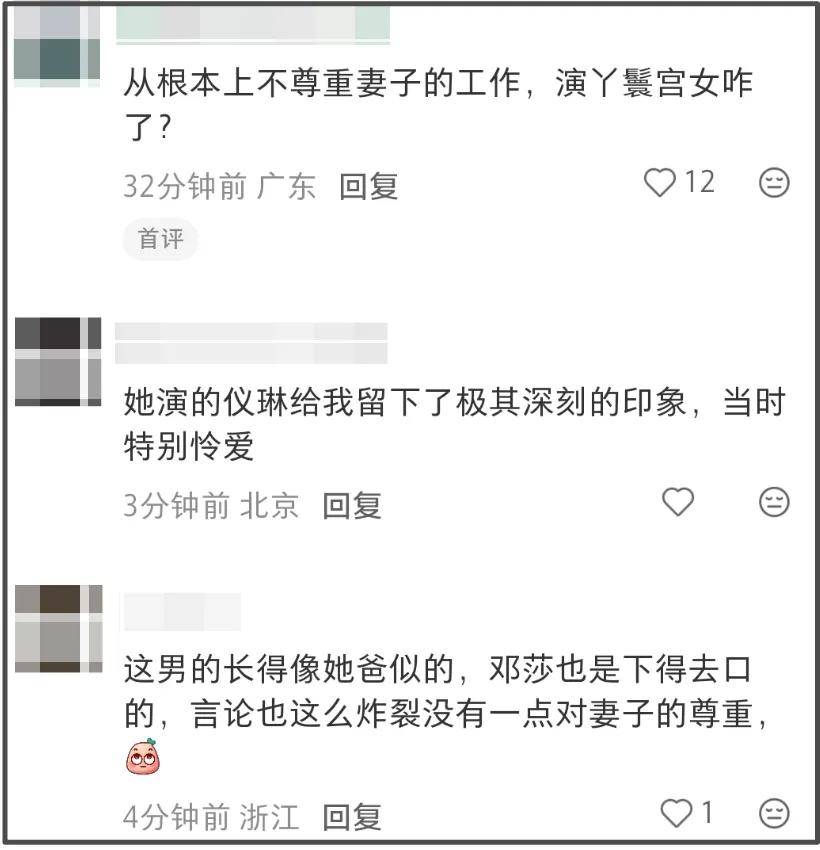 更令人无语的是,邓莎老公丝毫没有掩饰的意思,从眼神到话语都隐约流露出对邓莎演艺事业的轻蔑,邓莎直言老公从来没有看过她的演出,邓莎老公提起妻子演戏,开口就说邓莎都是演些丫鬟宫女之类的角色。