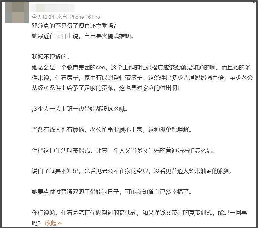 麦琳嫁李行亮,是真的流过产、吃过苦;邓莎嫁富商老公,婚姻模式一眼看透,对比普通人真正的丧偶式婚姻,颇有种何不食肉糜的感觉,都有网友忍不住吐槽她得了便宜还卖乖了。