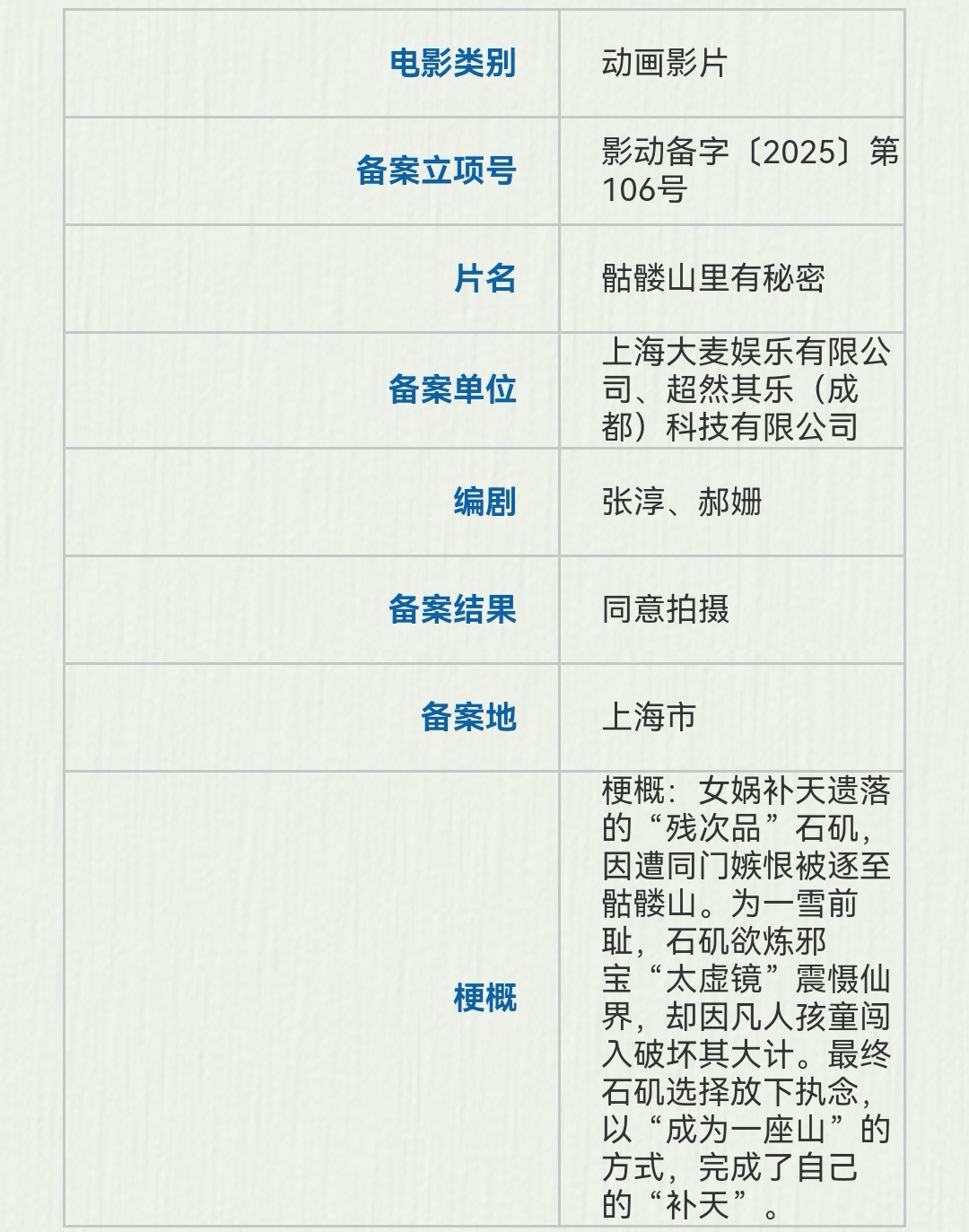 上海大麦娱乐、超然其乐(成都)科技备案了张淳、郝姗编剧的动画电影《骷髅山里有秘密》,故事讲的是女娲补天遗落的“残次品”石矶,因遭同门嫉恨被逐至骷髅山。为一雪前耻,石矶欲炼邪宝“太虚镜”震慑仙界,却因凡人孩童闯入破坏其大计。最终石矶选择放下执念,以“成为一座山”的方式,完成了自己的“补天”。