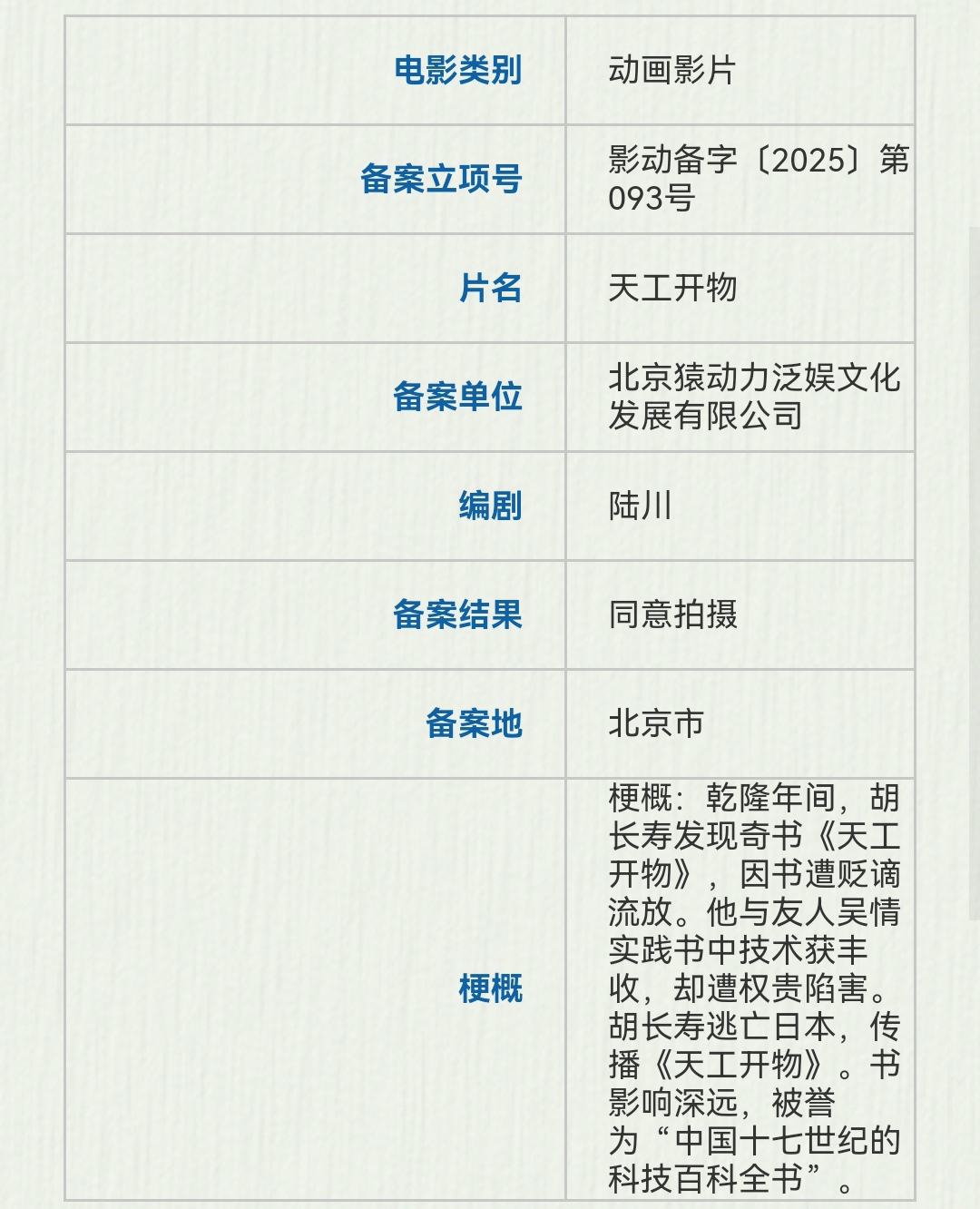 10月16日,国家电影局公示2025年9月上全国电影剧本(梗概)备案、立项结果。陆川的北京猿动力泛娱文化备案了陆川编剧的动画电影《天工开物》,故事讲的是乾隆年间,胡长寿发现奇书《