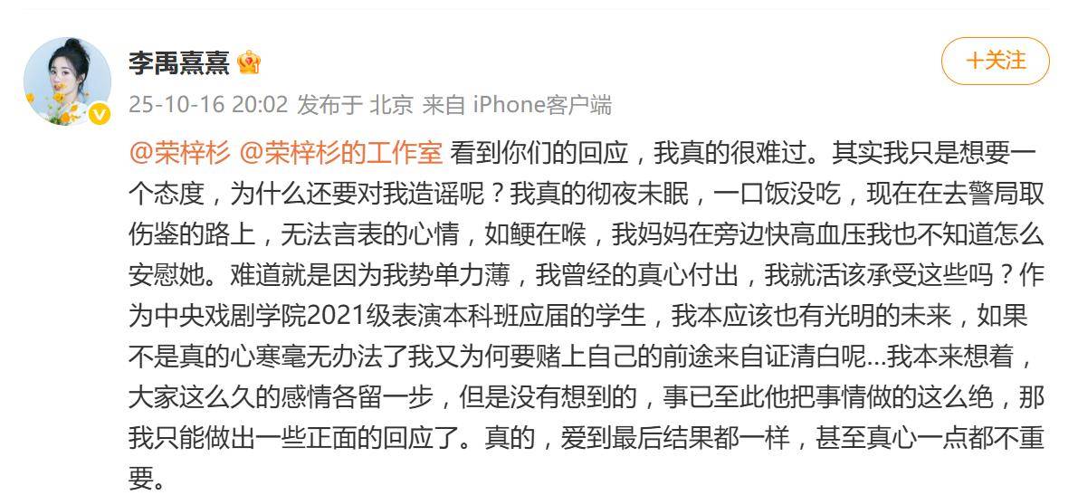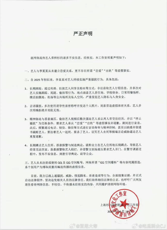 事件的导火索是荣梓杉工作室10月16日发表的一则严正声明。声明全盘否认了与李禹熹的恋爱关系,反而指控她长期跟踪骚扰、精神胁迫,甚至存在死亡威胁和恶意报警的行为,并强调已启动法律程序。工作室还特别指出,艺人从未注册QQ账号,试图斩断所有关联。