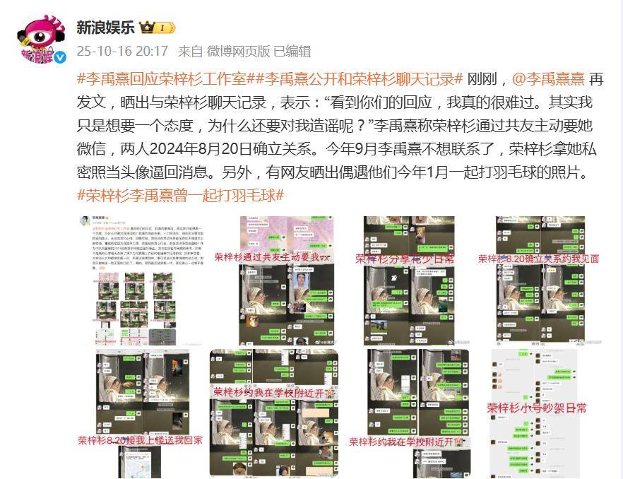 但这纸声明发出后不久,李禹熹的正面回应就“杀”到了。她直接晒出与荣梓杉的聊天记录,情绪激动地反问:“看到你们的回应,我真的很难过。其实我只是想要一个态度,为什么还要对我造谣呢?”据她所述,两人于2024年7月通过共同好友相识,是荣梓杉主动通过朋友索要了她的微信,并于8月20日正式确立恋爱关系。