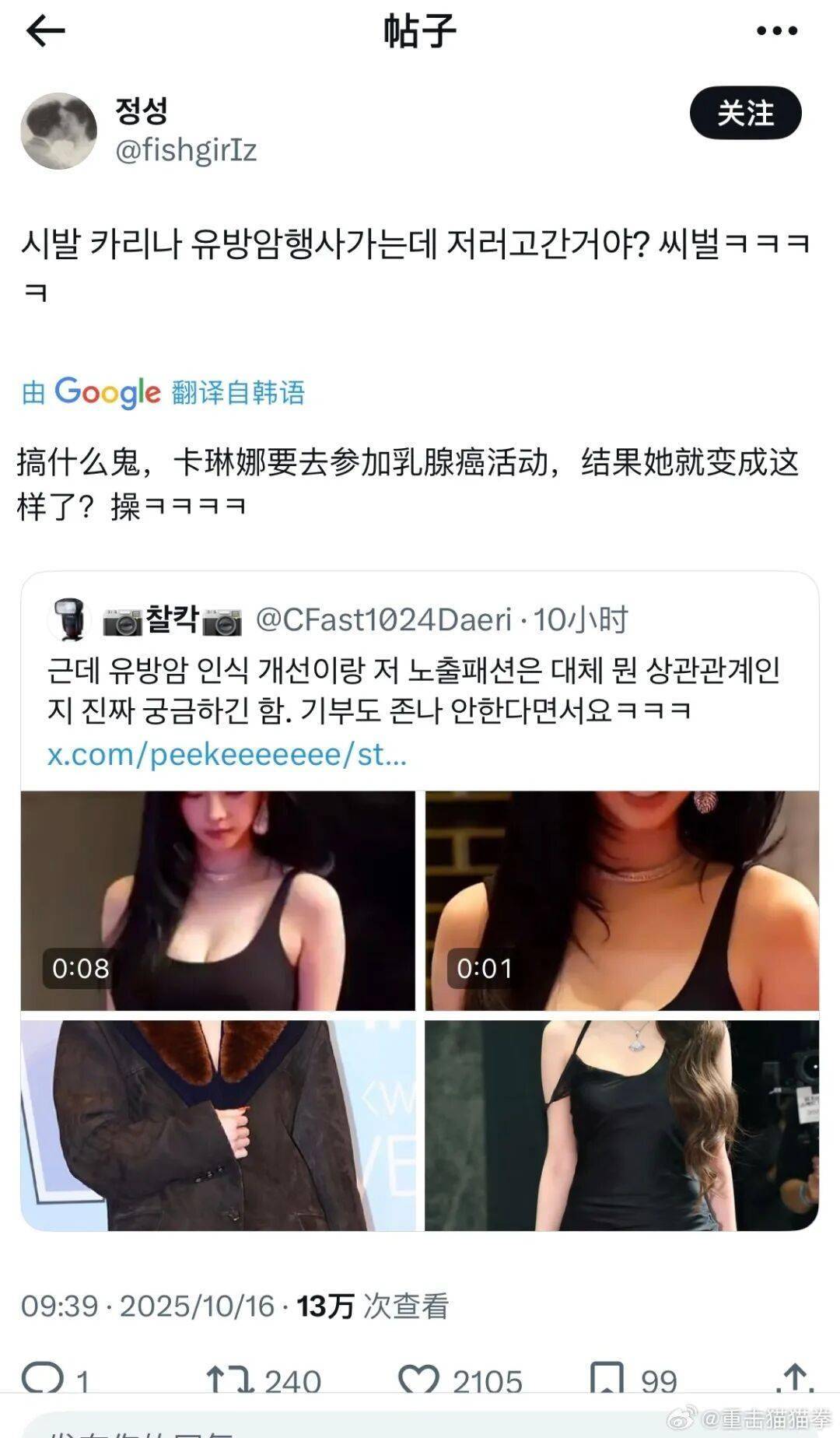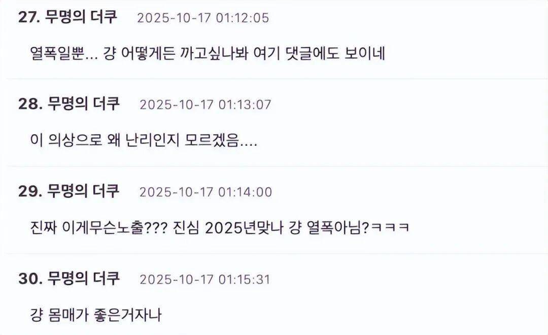 然而,随着恶意评论的蔓延,理性的声音也开始集结。在韩国热门论坛theqoo上,大批网友纷纷站出来为Karina辩护,直言批评者纯属“为黑而黑”。一条条高赞评论犀利回击:“实在不理解她为何要挨骂”、“这身装扮根本谈不上暴露”、“她很美。虽然不是粉丝,但我觉得这纯粹是嫉妒。那些人找到攻击点就兴奋不已”。