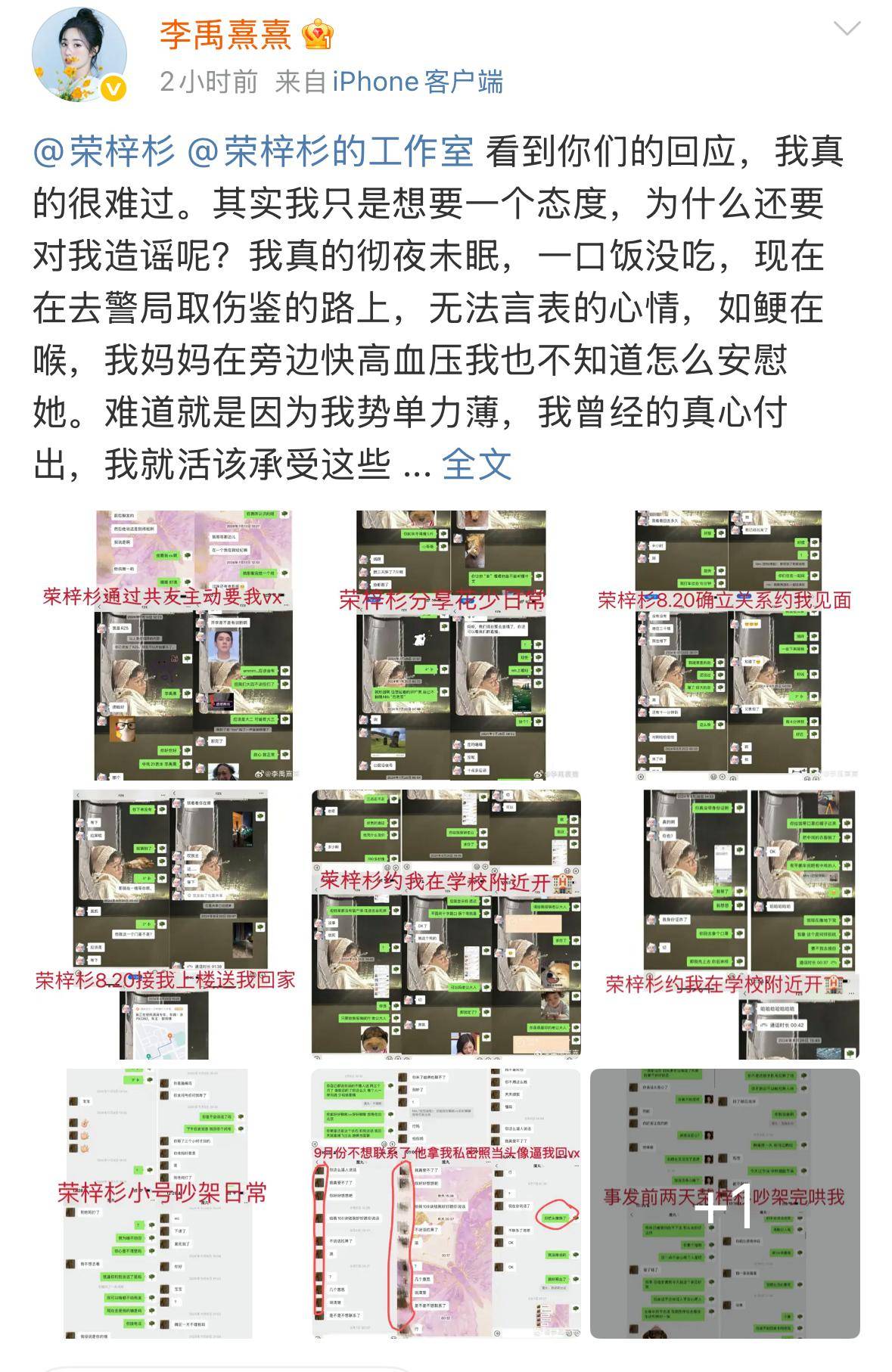 现在李禹熹不想当冤大头了,所以决定将此事画上句号,通过社交平台爆料荣梓杉出轨打人,还与经纪人一起威胁她。