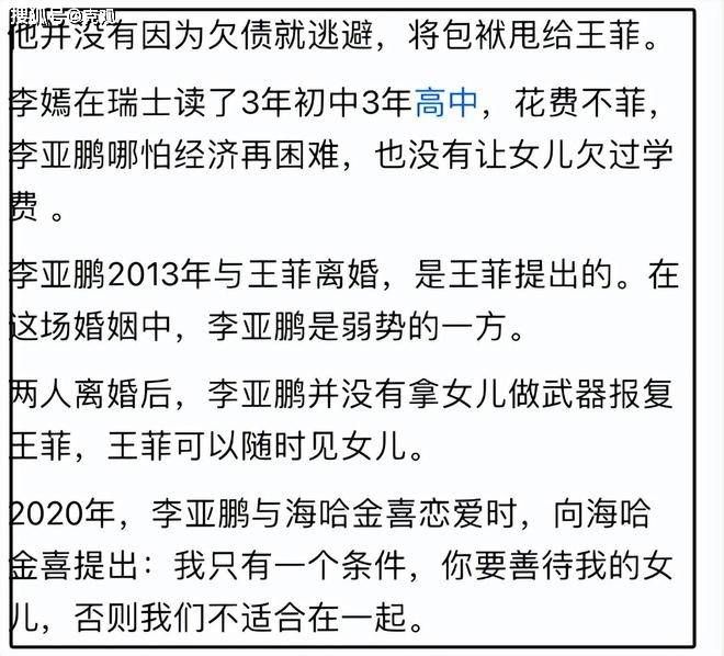 据业内吧奥利奥,离婚是王菲提出的,当时李亚鹏的经济更是已经崩盘了。但离婚后,李嫣在瑞士读了3年初中和高中,李亚鹏没有让女儿欠过学费。离婚后,李亚鹏也没有拿女儿作为威胁王菲的条件,王菲随时可以见女儿。