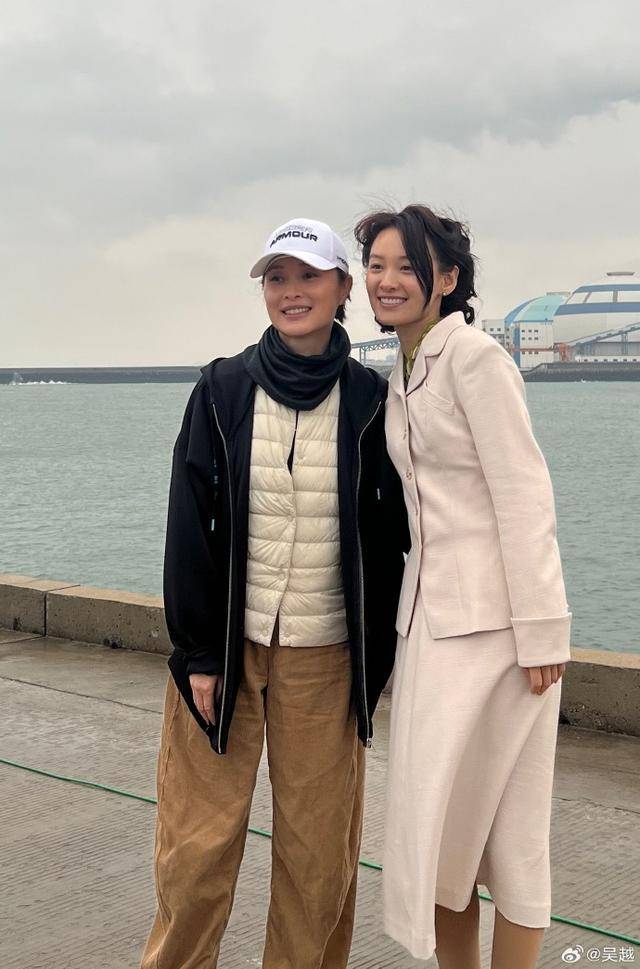 除了这些生活照,还有一张是吴越和剧中 “德英” 的扮演者合影,配文写着:“厦门大风,天气又冷了,冻一天的敬业的‘德英’姑娘。”