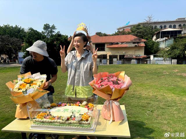 第6张是吴越在剧组过53岁生日的画面,她生日是4月10号,当时厦门已经有点热了,她穿着简单的灰色防晒衣,对着桌上的大蛋糕和两束鲜花笑得合不拢嘴。