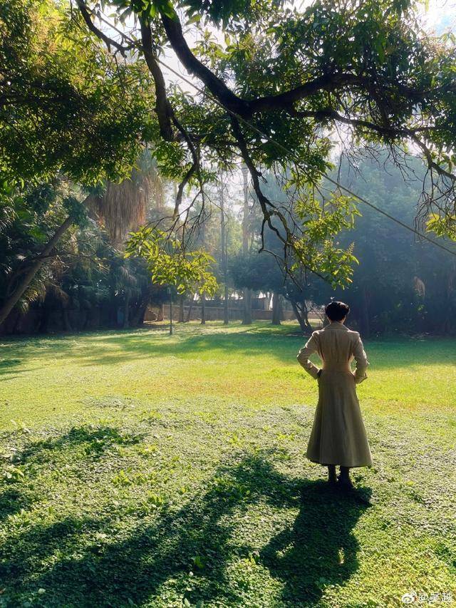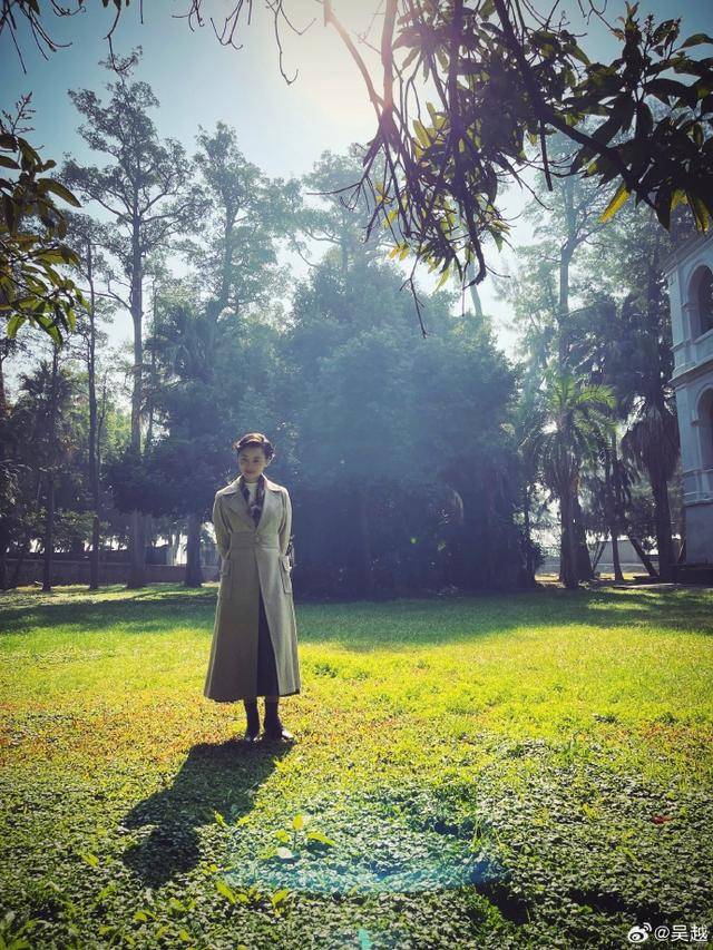 吴越穿了件剧中的米色风衣,站在草坪上拍了两张全身照,身姿纤细挺拔,整个人像从老电影里走出来的,优雅得不像话。