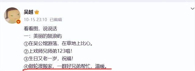 第7张照片有点特别,是吴越坐在轮渡上拍的,配文提了句 “做轮渡搬家,一群好兄弟帮忙,温暖”,因为太激动,“做”都写错了。