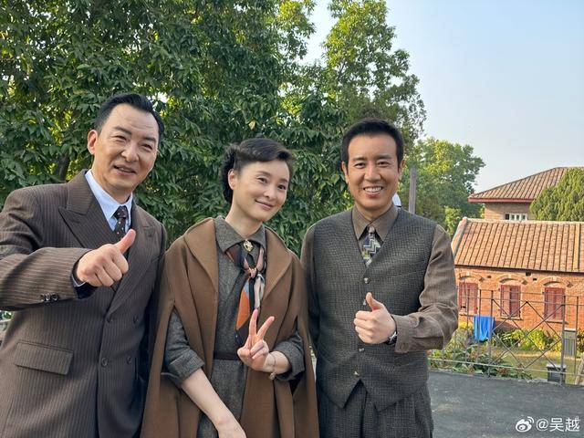 照片里吴越站在中间比了个剪刀手,三个人笑得眼睛都眯了,完全没有镜头前的严肃,一看就知道片场氛围有多好。