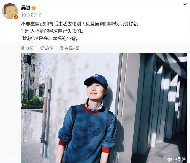 还有一张自拍,自然老去的吴越没开美颜没加滤镜,眼角的细纹都清晰可见。可她就大大方方对着镜头微笑,一点不藏着掖着,那股从容,比精致修图还让人喜欢。
