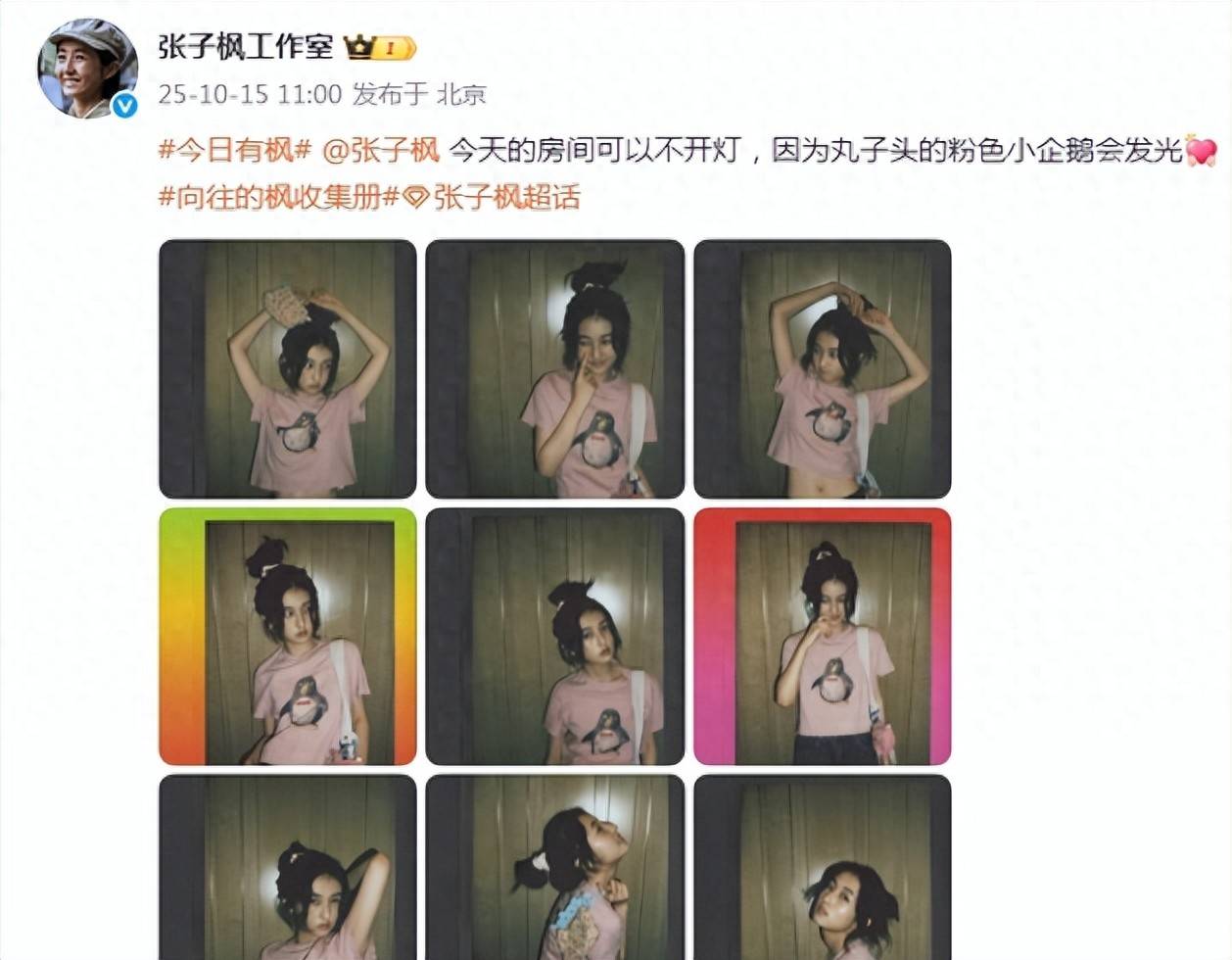 照片中,张子枫随性地将长发扎成高高的丸子头,显得既俏皮又可爱。她身穿粉色短袖搭配牛仔裤,肩挎同色系包包,整体造型粉嫩清新,十足青春美少女的气息。尤其值得一提的是,张子枫似乎全素颜出镜,满脸胶原蛋白与自然美貌,令人羡慕不已。