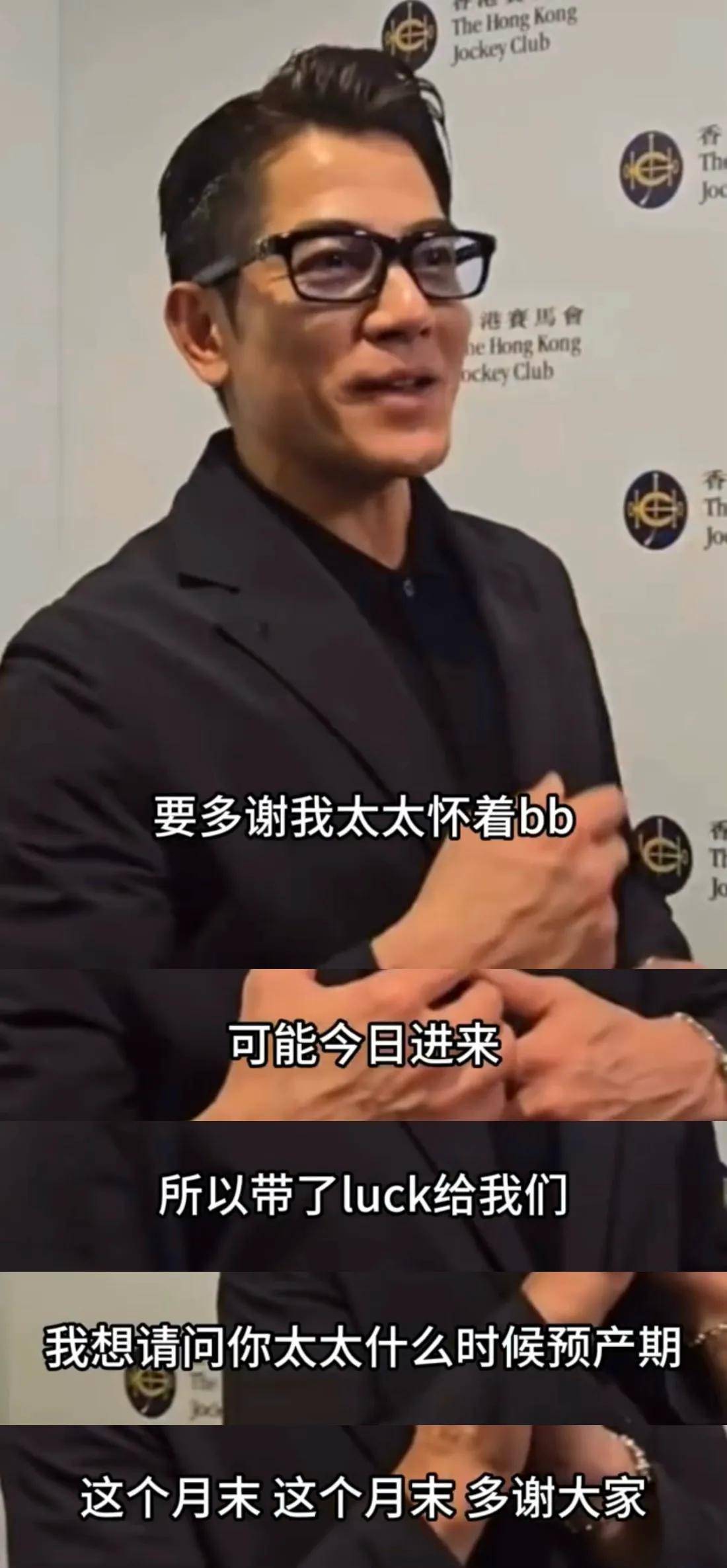 郭富城接受采访时,特别感谢怀孕的妻子远道支持,称这是他们的幸运。被问及预产期时,他满脸笑容大方透露:“就在这个月底。”