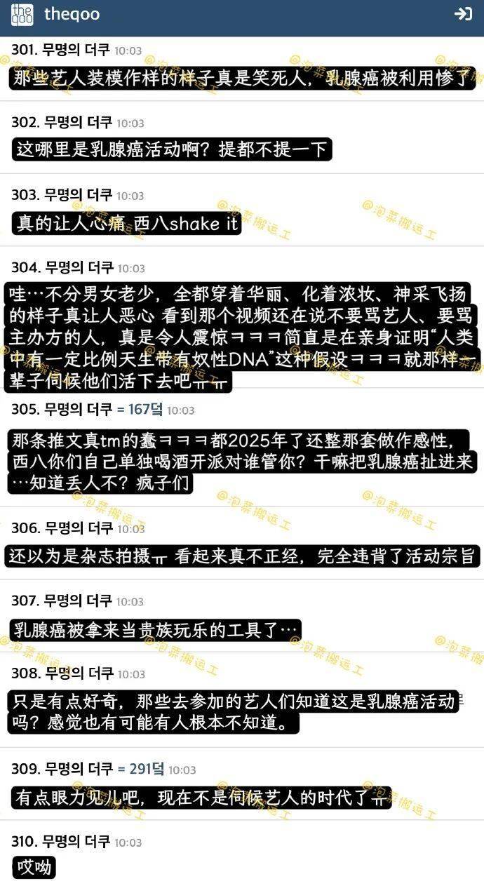 从缺失的粉红丝带,到跑偏的明星互动,从存疑的善款效率,到踩雷的演出内容——这场活动几乎每一步都精准踩在了公众的反感点上。韩网总结性批判道:这就是一场“借慈善之名的明星社交盛宴”,并要求主办方“干脆把‘乳腺癌’三个字从活动名称里拿掉”。