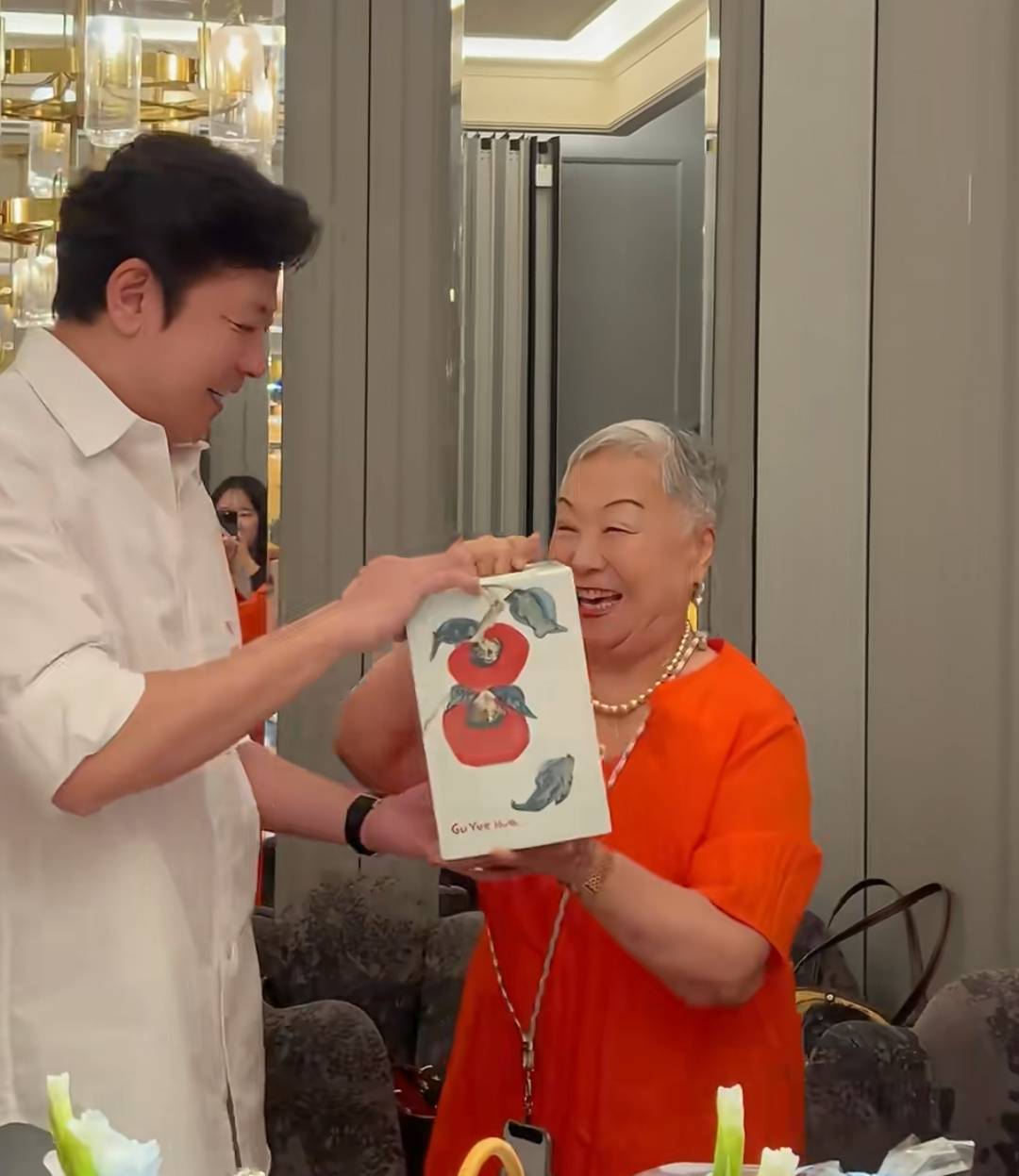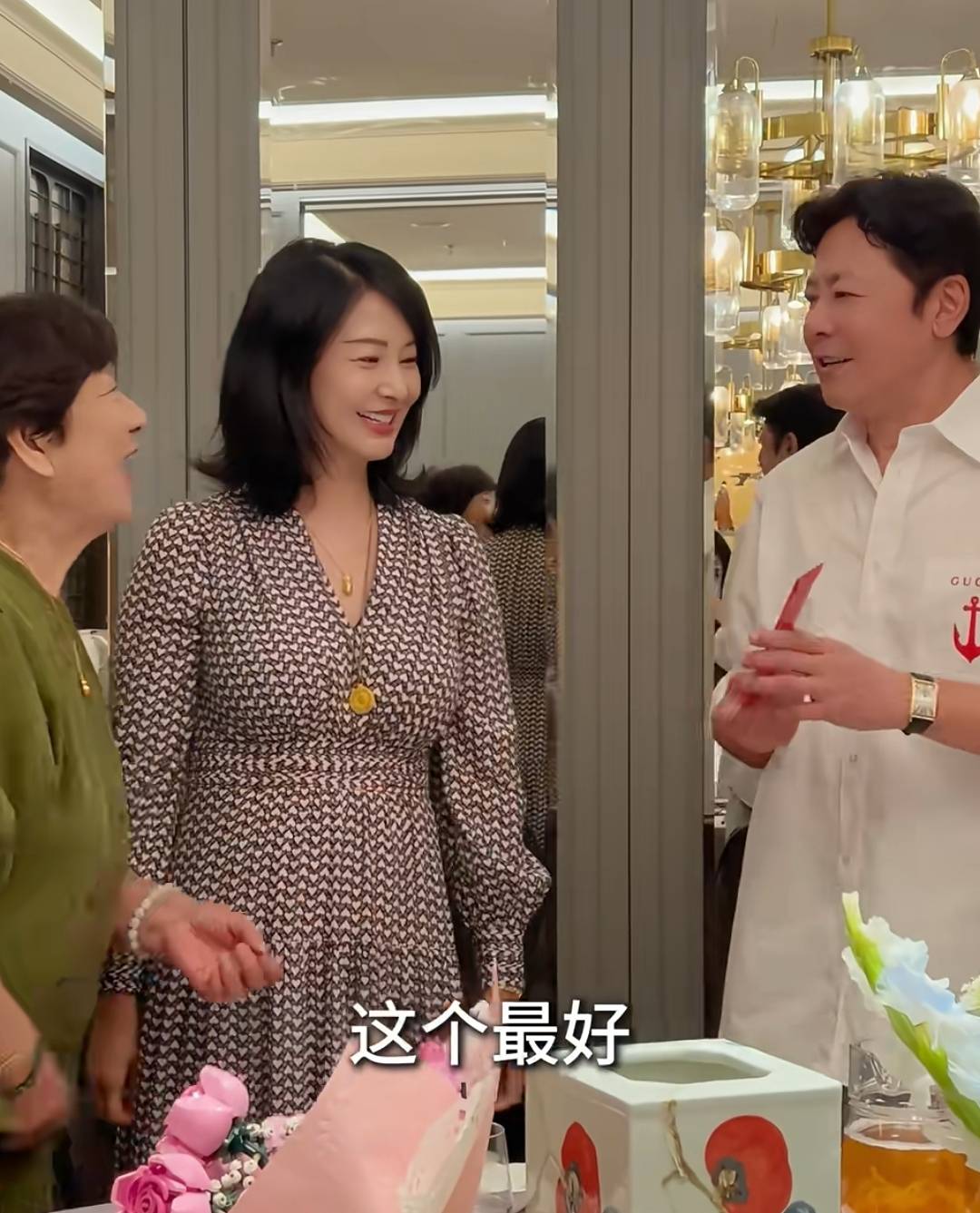 一直在旁边煽动气氛的刘茜,轮到婆婆送礼时,却变得安静了。孙思瀚老母亲送了一个“柿柿如意”的花瓶。
