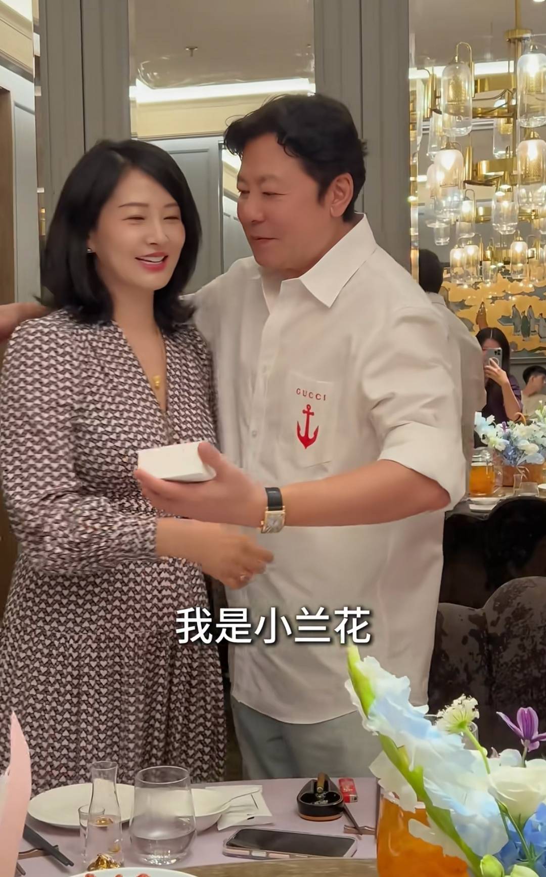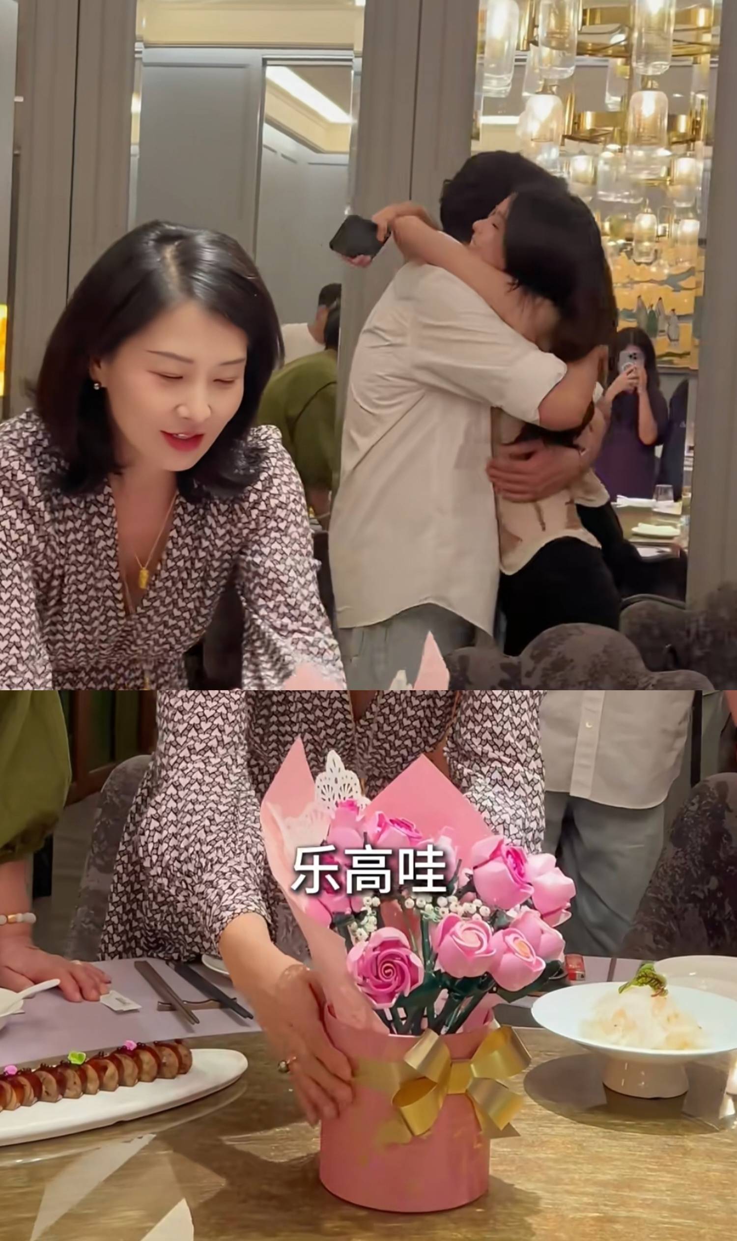 孙思瀚生日宴现场,老婆刘茜和女儿孙禾都送上了非常浪漫的小礼物,20岁的女儿孙禾给爸爸送上了自己拼的乐高花束,礼轻但情谊重,宠女的孙思瀚高兴得不行,给了女儿一个大大的拥抱。