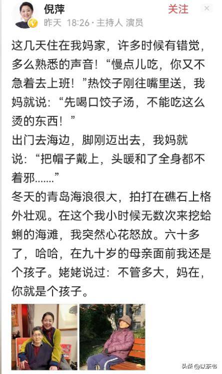 现如今,倪萍一直在坚持给老母亲养老,这是她作为子女应尽的职责。