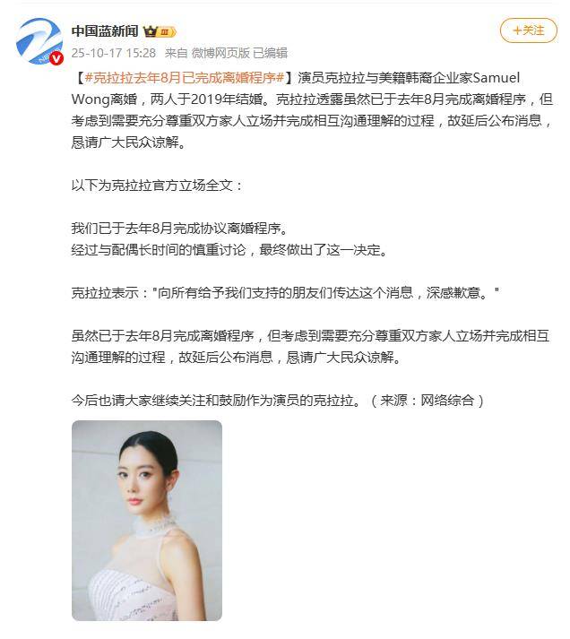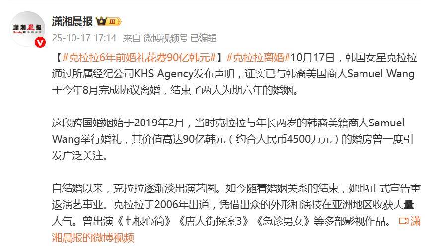 10月17日,韩国女星克拉拉通过经纪公司突然宣布离婚,结束了与美籍韩裔企业家Samuel Wong长达六年的婚姻。消息一出,迅速引爆亚洲社交媒体——许多网友甚至震惊表示:&l