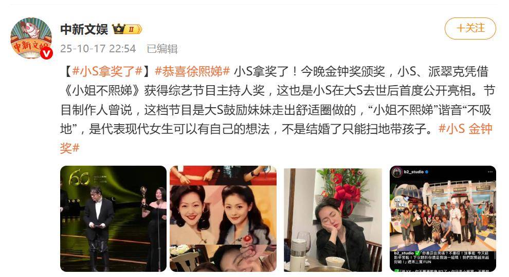 10月17日,小S(徐熙娣)的名字再次响彻第60届金钟奖颁奖典礼。她与搭档派翠克凭借综艺节目《小姐不熙娣》,一举斩获“综艺节目主持人奖”。这是她继《康熙来了》时代后,时隔多年再度捧起金钟奖杯,但这一次的获奖,却承载着远超事业成就的复杂情感——这是自2025年2月姐姐大S(徐熙媛)离世后,小S的首次公开亮相。