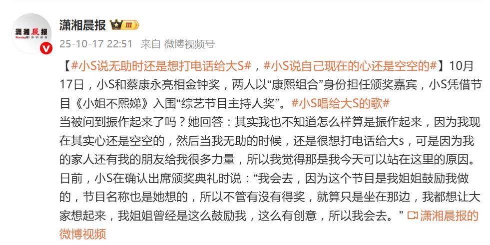 这场备受瞩目的回归,不只是一次获奖,更是一次公开的疗愈与告别。在全场的掌声与泪水中,小S证明了自己在职业上的坚韧,也毫无保留地展现了对姐姐最深切的怀念——那份“心空空”的失去感如此真实,而那份“绝不回头”的往前走,则需要莫大的勇气。