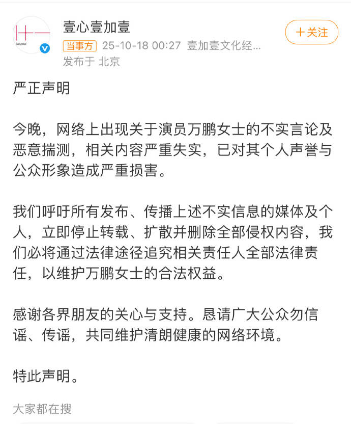 眼看舆论发酵,万鹏方反应迅速。10月18日凌晨,其经纪公司壹心壹加壹火速发布严正声明,直接定性张慧贤的言论为“不实信息及恶意揣测”,强调已严重损害艺人声誉,并强硬表态将依法追责。这份声明被大量网友赞为“及时又解气”,纷纷呼吁“理性吃瓜,等法律说话”。