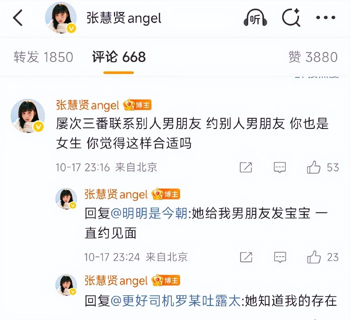 这边声明掷地有声,那边张慧贤却全程“口说无凭”。仅靠几句“她给我男朋友发宝宝”“一直约见面”的文字指控,就想坐实“知三当三”的重罪,网友显然不买账,批评她“空口造谣”“把网友当枪使”。虽然她以“保护素人”为由未公开男友信息,但万能的网友早已扒出男方昵称“森森”及外貌。更有人犀利指出:如果指控为真,那位男友同样行为越界,怎么张慧贤对他却半句批评都没有?这波“精准打击”难免让人心生疑问。