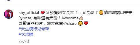 郭可盈在社交网晒出女儿的美照,大赞女儿是“衣架子身材”,她表示:“又发现女儿长大了,又长高了,随便就能摆出好看的姿势,有气质、有天分,太厉害了。”