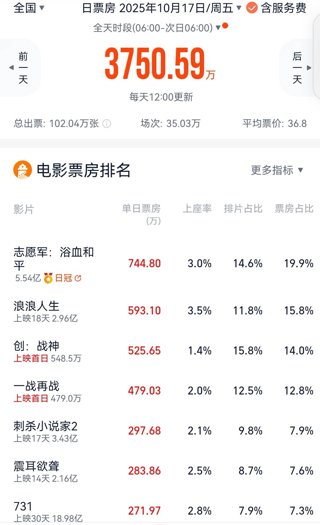 10月17日,两部好莱坞进口片《一战再战》《创:战神》上映,票房表现平平,未能改变大盘颓势。