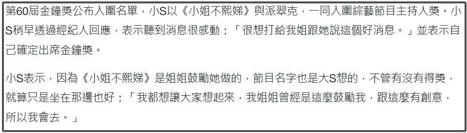 小S复出参加金钟奖,全程都拿悼念大S说事,确认提名了主持人奖,立马回应想打电话给大S,还要强调自己之所以参加颁奖礼,是因为想让外界想起大S。
