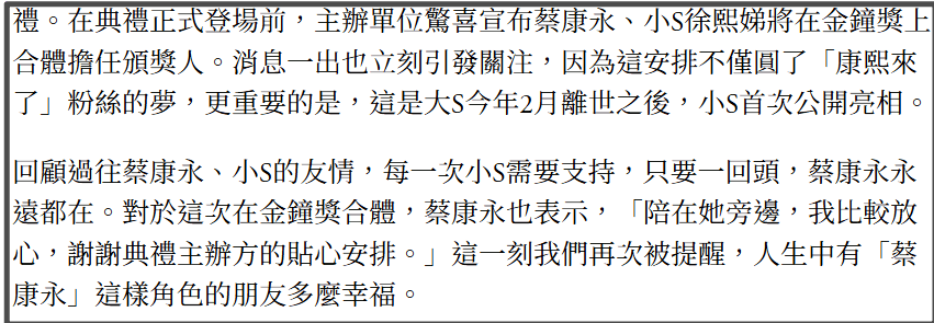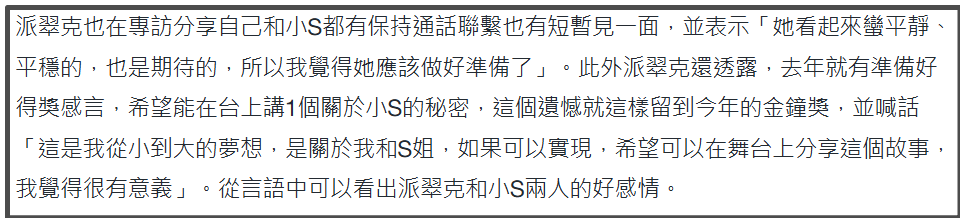 另外,不得不提的是,趁着大S离世8个月现身金钟奖,小S多多少少有点逼迫主办方给她奖项的嫌疑。