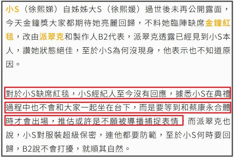 就像小S节目主持搭档派翠克和制作人B2都不知道,小S为什么临时决定不出席金钟奖红毯。