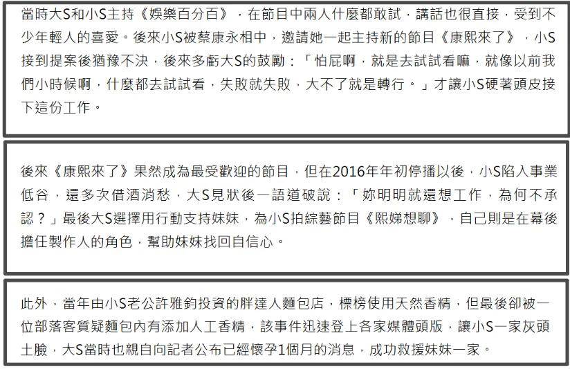 小S主持《康熙来了》,是大S鼓励的;小S老公面包店翻车,靠大S公布怀孕才转移了话题。