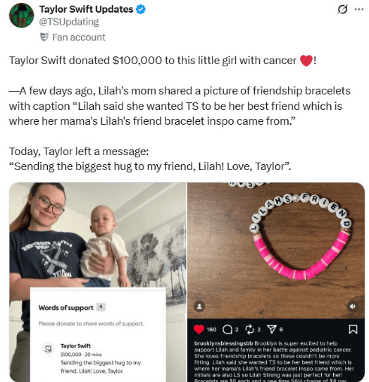 随后霉霉看到帖子后在她的捐款页面上捐了10万,并留言:“给我的朋友Lilah 一个最深切的拥抱!爱你的泰勒。”