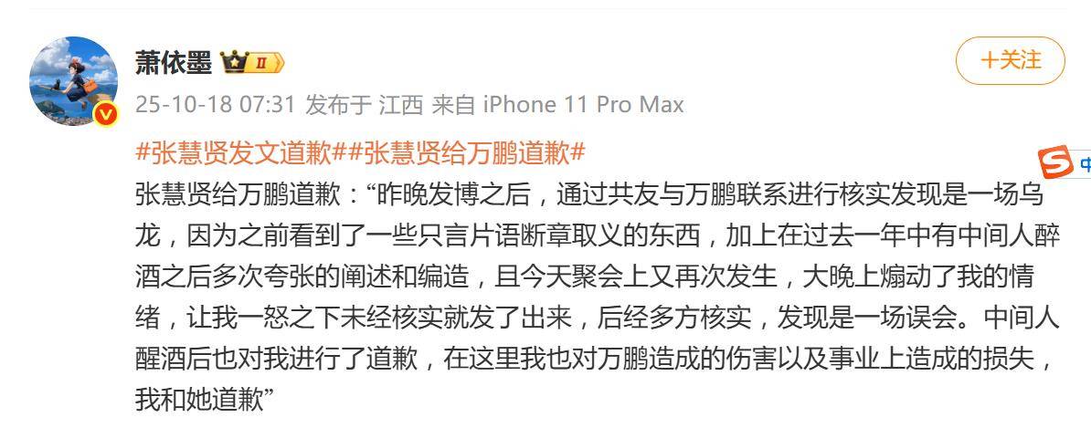 18日早晨7点,她发长文道歉,承认整件事是场“乌龙”。原来,所谓“暧昧联系”竟源于“中间人醉酒后的夸张编造”,而她因情绪上头未加核实就冲动开炮,直到通过共同朋友联系上万鹏本人多方核对,才发现自己被“坑”了。道歉文中,她虽对万鹏“造成的伤害及事业损失”表示歉意,却未直接艾特对方。