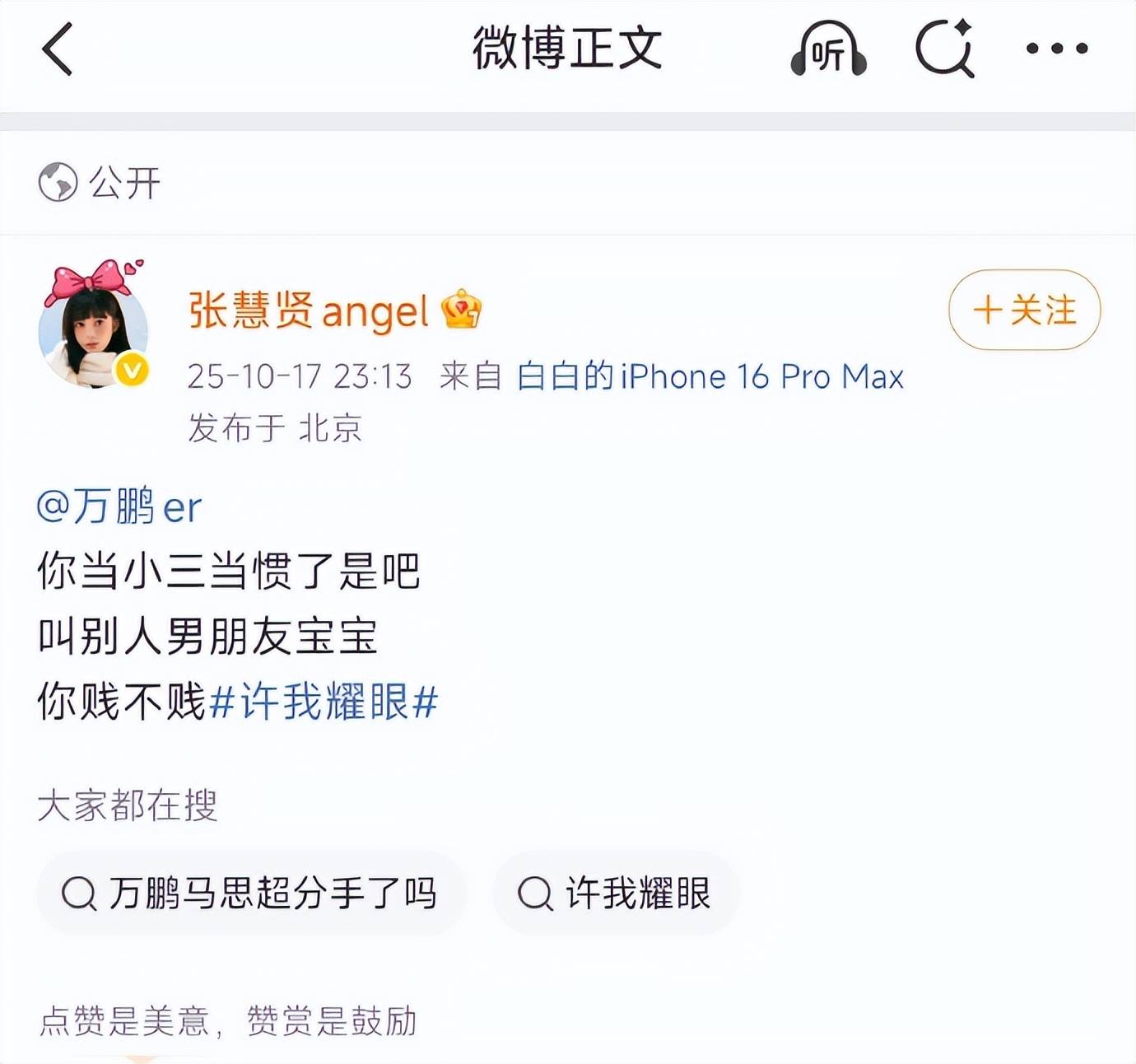 10月17日深夜,一场“手撕小三”的戏码在微博猝不及防地上演又落幕。网红张慧贤突然发文,直接点名演员万鹏,用“当小三当惯了”的激烈措辞指控其多次联系自己男友并称呼“宝宝”,却在未放出任何聊天记录、截图等实锤的情况下火速删博,并开启账号防护模式——这一连串操作,直接把网友看懵了。