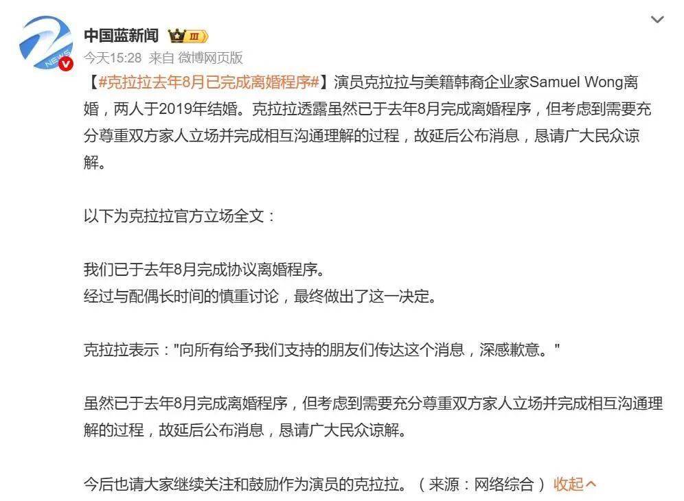 韩国演员克拉拉离婚的消息,在10月17日一经公布便迅速引爆舆论。更引人关注的是,这段婚姻实际上早在去年8月就已画上句号,延迟超过一年才公开的操作,让不少网友直呼“保密