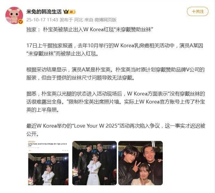10月17日,一则“朴宝英因未穿赞助丝袜被禁止走红毯”的独家新闻,瞬间点燃了韩网。这场发生于去年10月、直至今日才被揭开的幕后风波,让众多网友直呼:“时尚圈的规矩,比宫廷剧还严!”