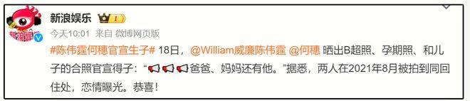 娱乐圈又多了一个孩子,但不是狗仔曝出的,而是当事人双双官宣。10月18日,何穗陈伟霆官宣生子,甩出孕肚照、孩子的照片,给了娱乐圈一记惊雷。网友更是万分震惊,表示甚至都不知道两