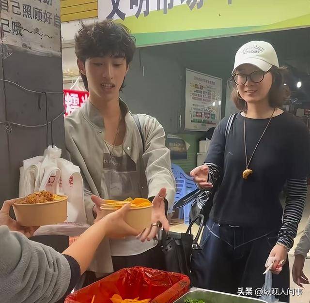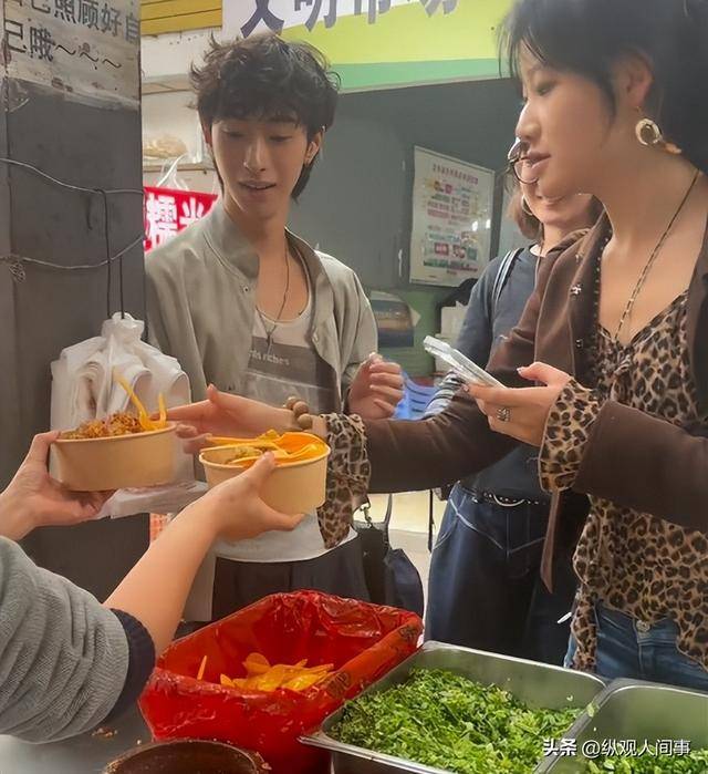 当时小摊的零嘴做好了,正从摊主手里接剪刀土豆,纸碗都快拿不住了,表情倒是挺放松,还跟摊主笑着说了句啥。