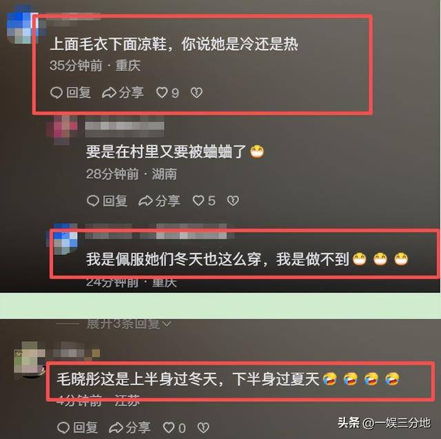 还有,毛晓彤上身穿着毛衣、下面搭配裙子和凉鞋,也不知道是冷还是热。