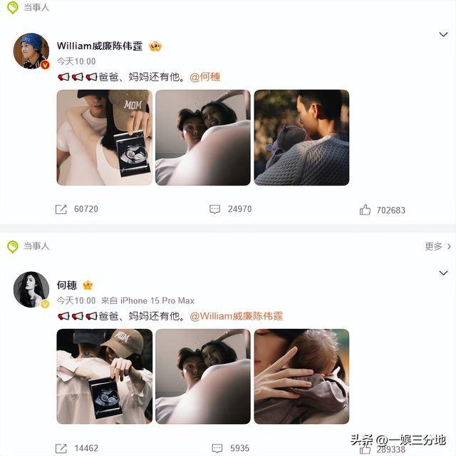 选了一模一样的文案来宣布,“爸爸妈妈还有他”,隔着屏幕都感觉到了幸福。