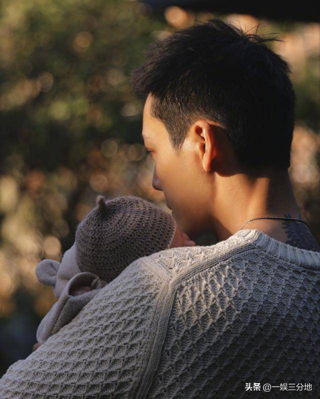 陈伟霆抱着孩子,露了后背,怀里的宝宝侧着身子,只看到了戴着帽子的小脑袋。