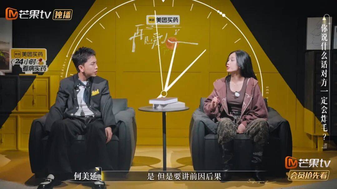 再看何美延与梁淞,这对被网友戏称为“rapper夫妻”的神仙组合,几乎把日常争吵变成了营销表演。英文“Come on”成了他们的情绪口头禅,互怼的押韵节奏像是即兴说唱,这样的呈现好似一切都是为了制造那个肯定会火的热搜标题——#我同意再见爱人转型喜剧综艺#。