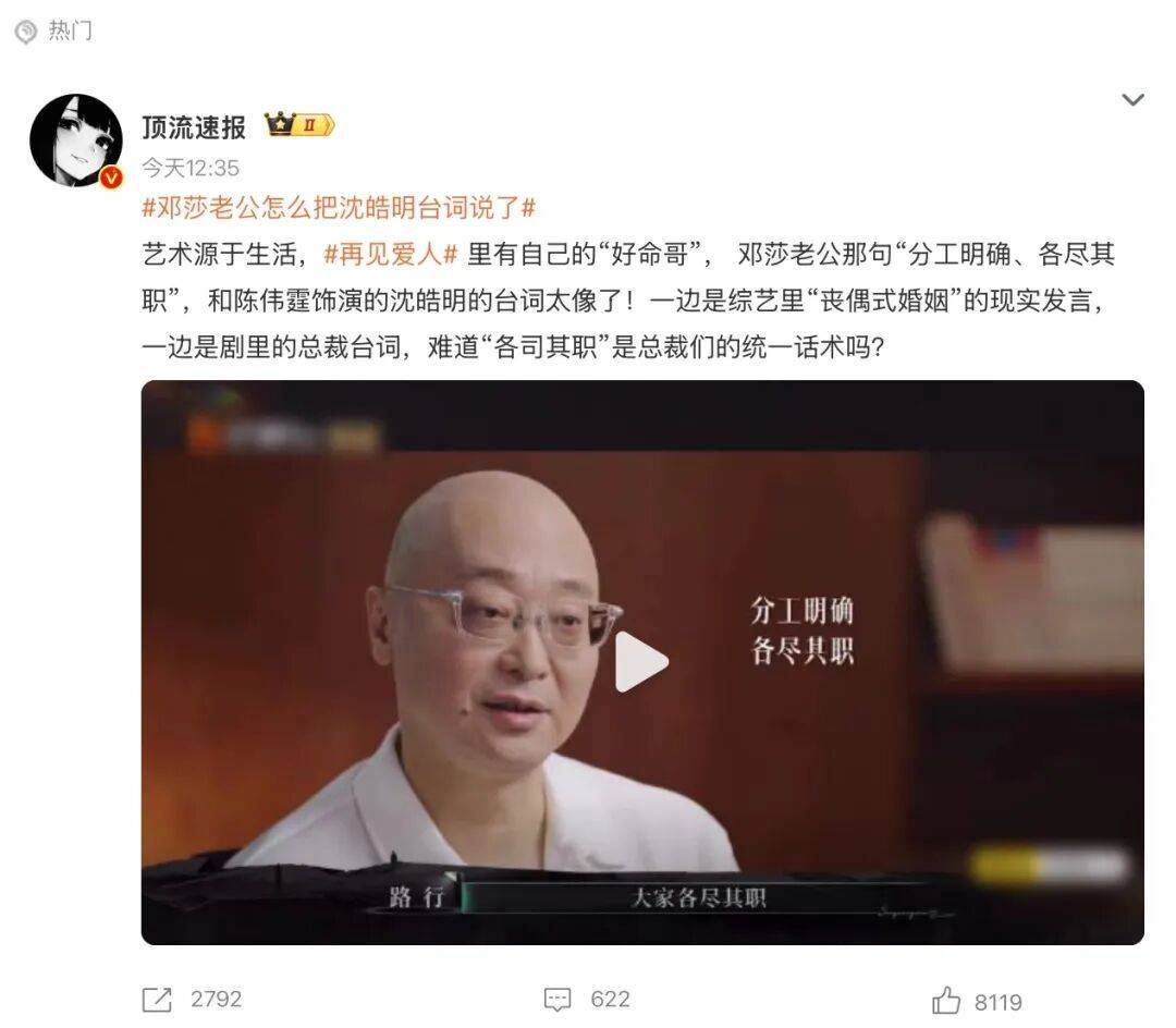 所以你看这季节目的热搜词条拿捏得就很“政治正确”。什么 #邓莎老公怎么把沈皓明台词说了#,直指路行魂穿《许我耀眼》男主沈皓明对邓莎轻描淡写说的那句“分工明确、各尽其职”是给丧偶式婚姻盖了个戳;还有什么 ##车崇健让朋友睡在李施嬅的床上#,不知前因后果的网友看了还以为是啥劲爆出轨奸情的热搜就像是一刻也等不及地要给大猪蹄子车崇健“定罪”……