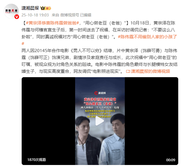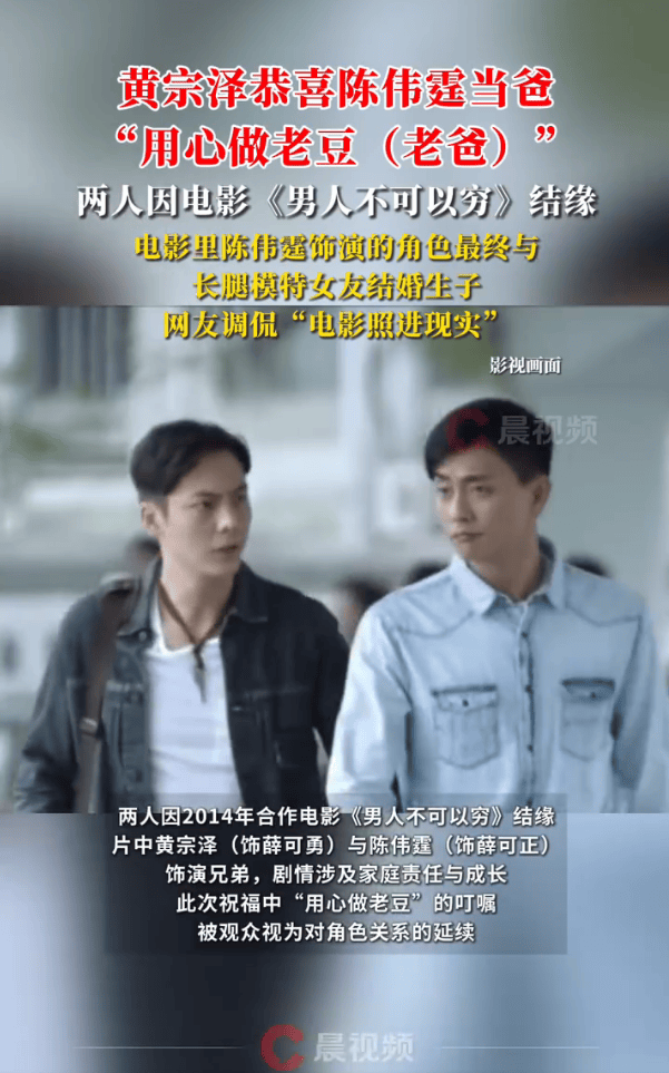 两人因2014年合作电影《男人不可以穷》结缘,片中黄宗泽(饰薛可勇)与陈伟霆(饰薛可正)饰演兄弟,剧情涉及家庭责任与成长,此次祝福中“用心做老豆”的叮嘱,被观众视为对角色关系的延续。电影中陈伟霆的角色最终与长腿模特女友结婚生子,与现实高度重合,网友调侃“电影照进现实”。