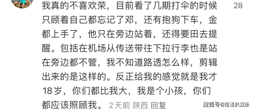 情商低到离谱。和邓恩熙打一柄伞,邓恩熙半个身子都淋在雨里。想吃周雨彤的零食,吃完了就把包推给金晨带着。