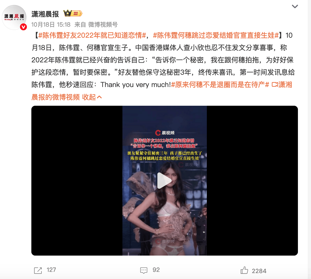 10月18日,陈伟霆、何穗官宣生子。中国香港媒体人查小欣也忍不住发文分享喜事,称2022年陈伟霆就已经兴奋的告诉自己:“告诉你一个秘密,我在跟何穗拍拖,为好好保护这段恋情,暂时要保密。”好友替他保守这秘密3年,终传来喜讯,第一时间发讯息给陈伟霆,他秒速回应:Thank you very much!
