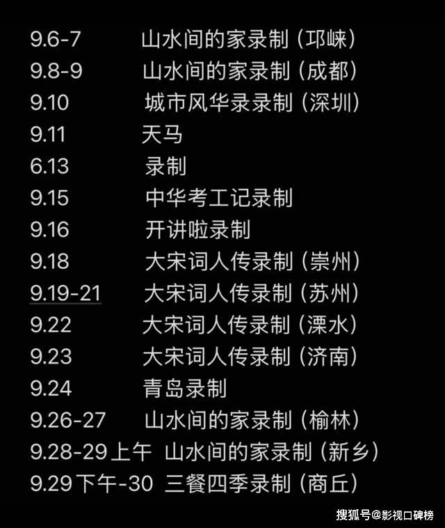 看看撒贝宁那份流出的9月行程表,密密麻麻的安排简直让人眼花缭乱。从月初的6、7日在四川邛崃录制《山水间的家》,紧接着8、9号转战成都继续录,10日就飞到了深圳录《城市风华录》。这还没完,中间穿插着《开讲啦》、《中华考工记》的录制,然后从18日开始,更是开启了环中国模式,为了《大宋词人传》一连跑了崇州、苏州、溧水、济南四个地方,22日在济南录完,24日又出现在青岛。月底的最后几天,他再次回到《山水间的家》,从陕西榆林录到河南新乡,最后在商丘录完《三餐四季》,才算给这个魔鬼九月画上句号。