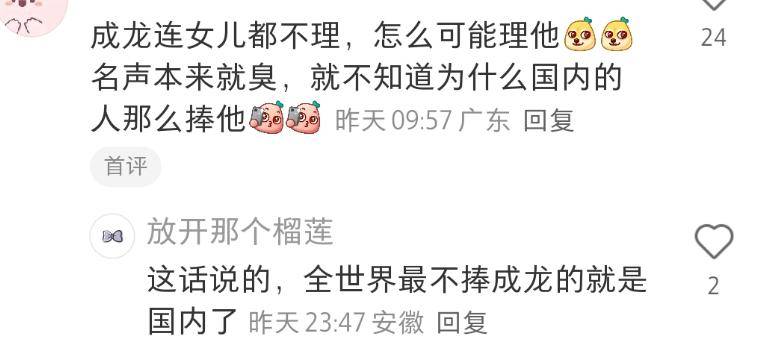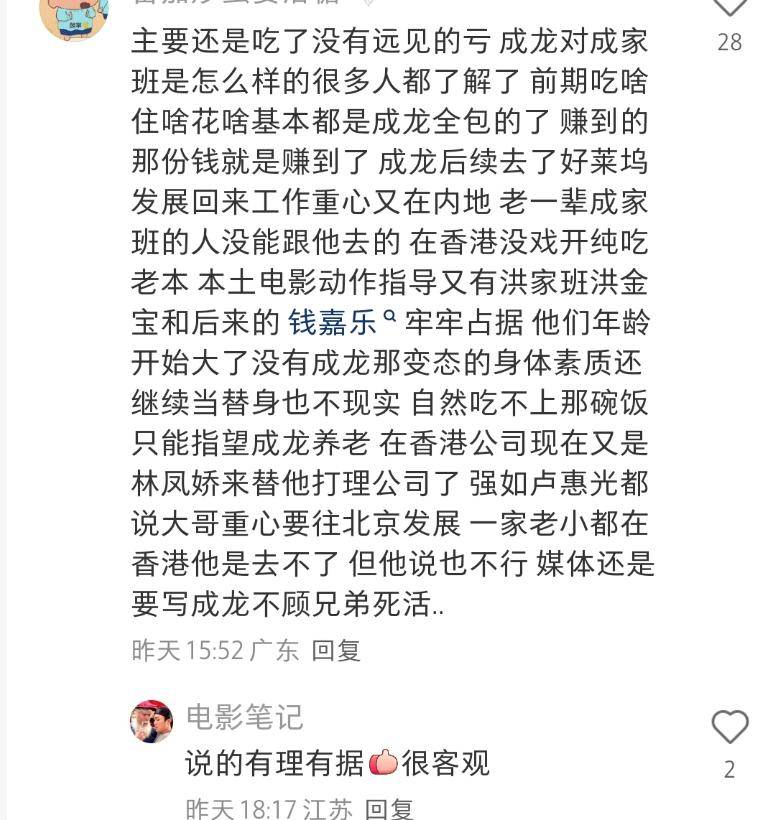 评论区也有网友指出说法中的漏洞,更像是他这些年混得不好,强求成龙念旧情帮他养老,成龙做不到这一点,他就恼羞成怒出来爆料。