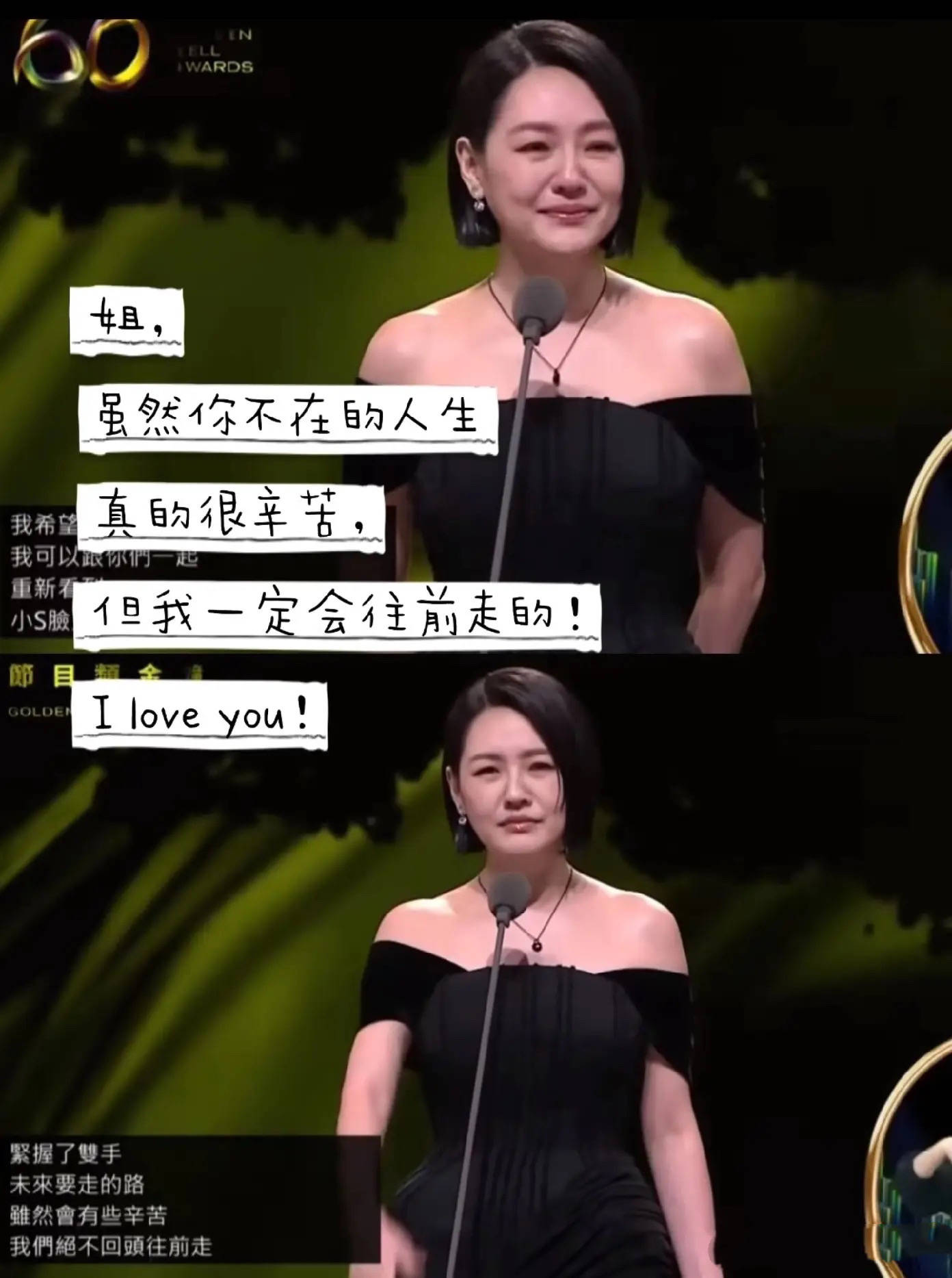 不知道是节目效果,还是小S的真情流露,她又一次感动了观众。让人深切理会了失去亲人的那种“痛彻心扉”,领奖台上又哭又笑,喊:姐!那模样太让人心疼了。